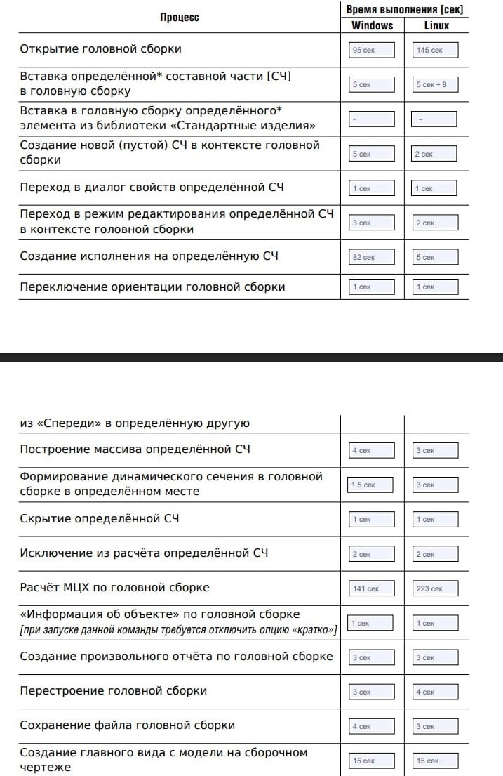 Сценарий тестирования предусматривал взаимодействие с моделями, изначально разработанными в ОС Windows: открытие, изменение, соответствие операций, оформление чертежей. В тестах производительности сравнивалось потребление ресурсов ПК, качество отображения моделей и чертежей, задержки графики при позиционировании и масштабировании, время выполнения операций.